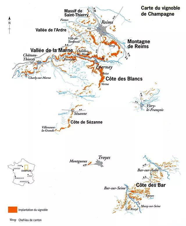主要分布在蘭斯山區La Montagne de Reims、白坡La Côte des Blancs、馬恩河谷La Vallee de la Marne、巴爾坡地La Côte des Bar。