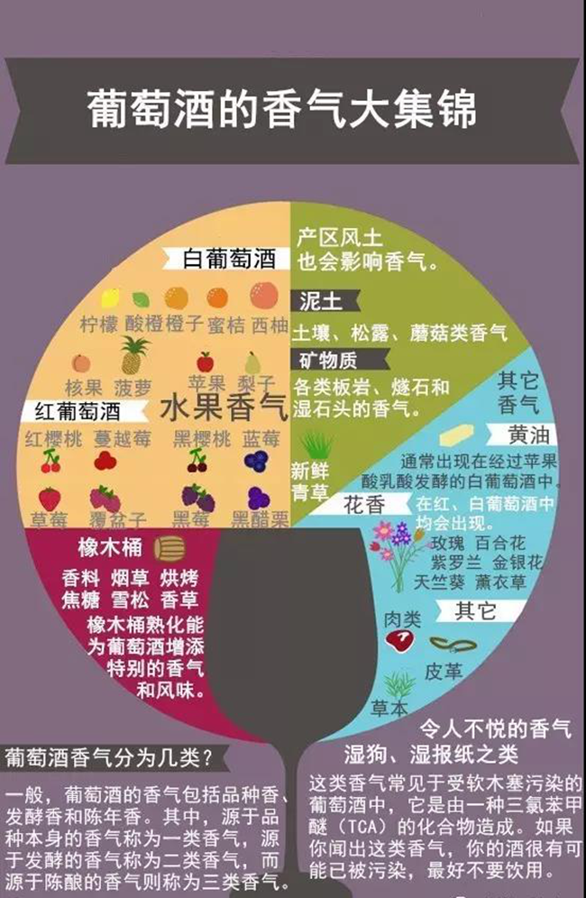 在葡萄酒的世界中至少存在著上百種不同的氣味。不是所有氣味都是容易識別的。為了鑒別,品酒師把這些氣味進(jìn)行分類重組。每組類別的定義及其包含的氣味各不相同,如水果可以分為柑橘類、紅色水果、黑色水果、熱帶水果等,糕點類可以分為黃油、餅干、奶油面包、吐司等,另外還有花卉類、木質(zhì)類、糖果類、植物類、香料類、動物類和礦物類等,每一個類別你需要有一些香氣記憶的儲備(詳見附圖)。