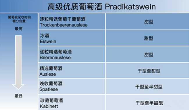 在德國,PDO葡萄酒的產(chǎn)量最大,而其中高級優(yōu)質(zhì)葡萄酒占有非常重要的地位。由于氣候寒冷,葡萄的成熟度對于德國葡萄酒來說至關(guān)重要,于是法律根據(jù)葡萄采收時的成熟度,又將高級優(yōu)質(zhì)葡萄酒細分為以下6個等級。別看它很復(fù)雜,但只要將這一分級看做葡萄酒的風(fēng)格劃分,理解起來就很容易了。