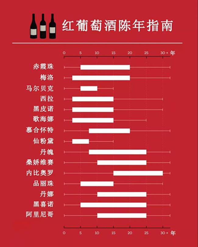 以上紅葡萄酒的陳年影響因素與葡萄品種本身有很大的關(guān)系,以下是一個簡潔版的紅葡萄品種的陳年指南,僅供參考: