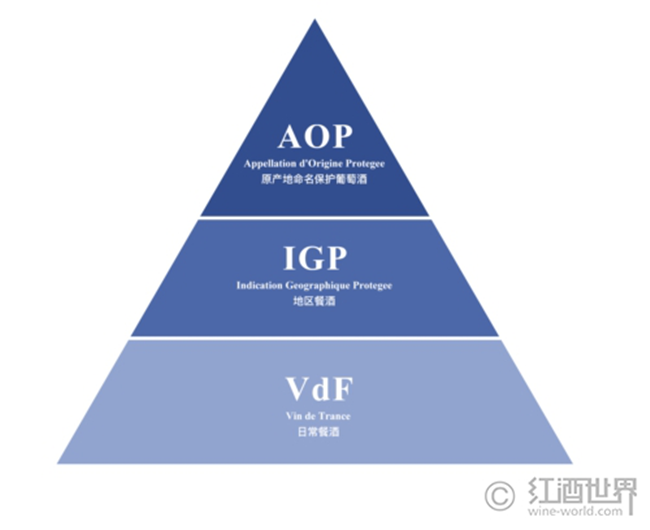 后來為了響應(yīng)歐盟的改革并配合歐洲農(nóng)產(chǎn)品級(jí)別標(biāo)注形式,法國(guó)于2012年推出新的分級(jí)體系——原產(chǎn)地命名保護(hù)制度(Appellation d'Origine Protegee,簡(jiǎn)稱AOP)。這個(gè)體系從高至低包含原產(chǎn)地命名保護(hù)葡萄酒(AOP)、地區(qū)餐酒(Indication Geographique Protegee/IGP)與日常餐酒(Vin de France/VdF)三個(gè)級(jí)別,分別取代原來的AOC、VdP和VdT,并撤銷了VDQS 這一等級(jí),原有的 VDQS 葡萄酒或升級(jí)為AOP,或降級(jí)為VdF。