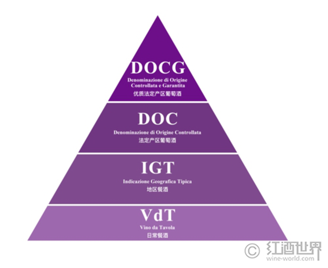 上世紀(jì)60年代之前,意大利尚沒有確立行之有效的葡萄酒分級(jí)制度,消費(fèi)者難以在種類繁多的意大利葡萄酒中甄別出優(yōu)質(zhì)佳釀,這很大程度上阻礙了意大利葡萄酒在國(guó)際市場(chǎng)上的發(fā)展。于是從1963年開始,意大利便逐步建立并完善其葡萄酒分級(jí)體系,把葡萄酒劃分為4個(gè)品質(zhì)級(jí)別。