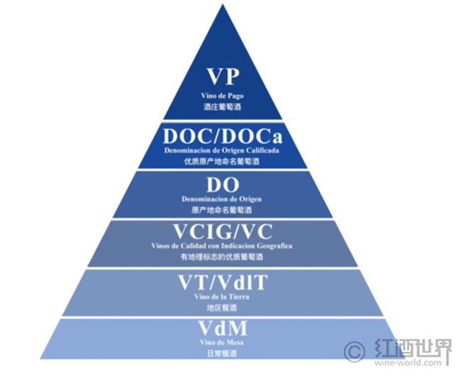 西班牙在20世紀(jì)30年代初期就擬定了原產(chǎn)地命名制度(Denominacion de Origen,簡(jiǎn)稱DO),但直到70年代才正式頒布實(shí)施。傳統(tǒng)的西班牙葡萄酒分級(jí)體系和法國(guó)的等級(jí)劃分大有不同,不過自2003年改革后,其框架已越來越接近于法國(guó)的分級(jí)體系。西班牙的葡萄酒分級(jí)包含以下6個(gè)級(jí)別: