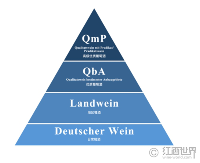 簡(jiǎn)單來說,德國(guó)葡萄酒分為日常餐酒(Deutscher Wein)、地區(qū)餐酒(Landwein)、優(yōu)質(zhì)葡萄酒(Qualitatswein bestimmter Anbaugebiete/QbA)和高級(jí)優(yōu)質(zhì)葡萄酒(Pradikatswein)4個(gè)等級(jí)。