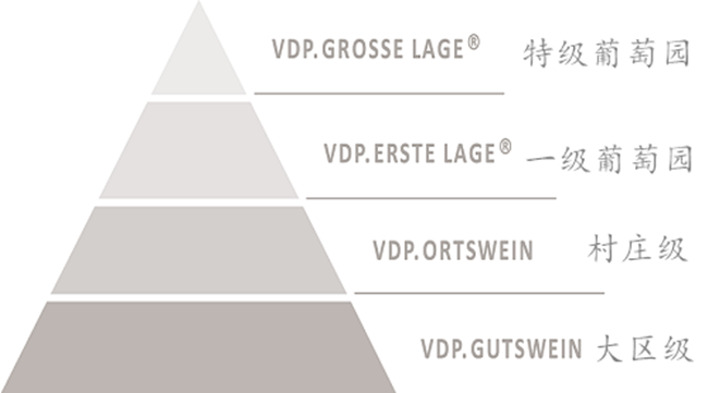 除此之外,由德國(guó)頂尖酒莊組成的德國(guó)名莊聯(lián)盟(Verband Deutscher Pradikatsweinguter,簡(jiǎn)稱VDP)也推出了適用于成員酒莊的分級(jí)體系。與官方的分級(jí)制度不同,該體系依據(jù)葡萄園的質(zhì)量和風(fēng)土特點(diǎn)、葡萄種植技術(shù)及年份品質(zhì),將葡萄園分為4個(gè)等級(jí)。