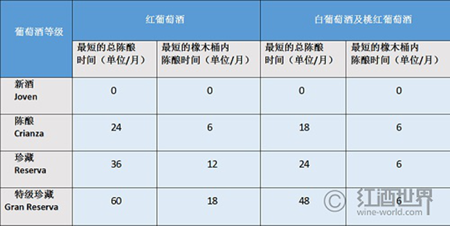 需要注意的是,該表標注的只是西班牙規(guī)定的最短陳釀時間,而有些子產(chǎn)區(qū),如里奧哈(Rioja)和杜埃羅河岸(Ribera del Duero)等,對總陳釀時間及(或)橡木桶內陳釀時間的要求一般更高。