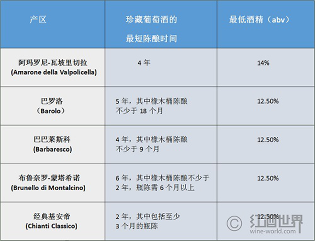 意大利用“Riserva”來表示珍藏,并對該詞的使用作出了嚴格規(guī)定。但不同于西班牙,意大利的規(guī)定并不統(tǒng)一,而是依各個產(chǎn)區(qū)的法規(guī)而定:“珍藏”葡萄酒的酒精度和陳釀時間均需要超過其所在產(chǎn)區(qū)的法定最低標準。因此,在意大利不同的產(chǎn)區(qū),“珍藏”葡萄酒需要滿足的標準大有不同,具體可見下表:
