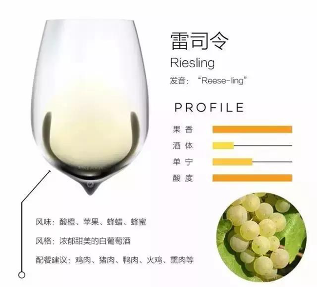 雷司令是一款源自德國(guó)的、半干型(也有干型)、芳香濃郁的白葡萄酒,是德國(guó)非常重要的葡萄酒。