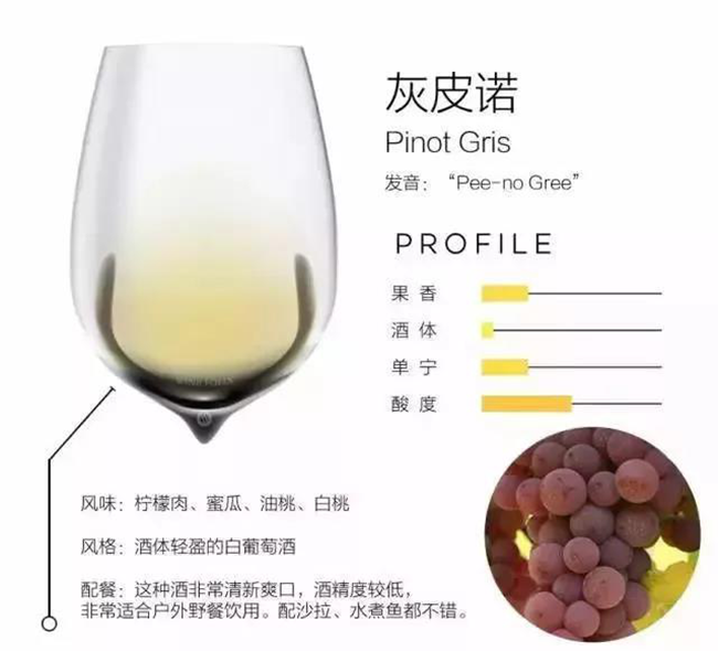 灰皮諾是一款源自意大利北部和法國(guó)的、干型、酒體輕盈的白葡萄酒。這種葡萄酒非常清新爽口,酒精度較低(12%),非常適合戶外野餐飲用。