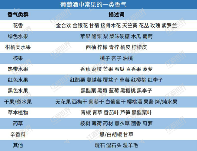 葡萄酒的一類香氣為葡萄品種自帶的香氣和酒精發(fā)酵過程中產(chǎn)生的香氣,主要表現(xiàn)為葡萄酒中各類新鮮的花香、果香和草本香氣等,這些香氣在不同產(chǎn)區(qū)的氣候條件下也會展現(xiàn)出不同的側(cè)重點。一款簡單易飲的葡萄酒通常只會展現(xiàn)出有限的一類香氣,且往往都是來自同一類群的香味,如熱帶水果香氣或者柑橘類果香。而一款復(fù)雜的葡萄酒通常會展現(xiàn)出不同類群的香氣,如同時帶有紅色水果、黑色水果和草本植物的香氣。