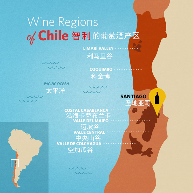 從首都圣地亞哥出發,很快就能到達智利一些最為著名的葡萄產區。這些地區的葡萄種類繁多,既出產單一品種的葡萄酒,也出產混釀葡萄酒。在美國市場上,智利的葡萄酒一直都比較暢銷,其中空加瓜谷、中央山谷(Valle Central)和邁坡谷是智利銷量最大的三個產區。