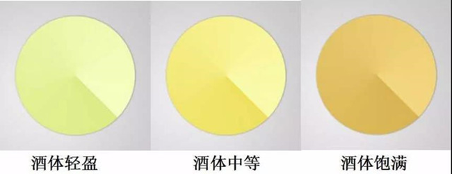 酒體輕盈的白葡萄酒,如灰皮諾(Pinot Grigio)和綠酒(Vinho Verde),顏色是從無色到淺青黃色;酒體中等的白葡萄酒,如長相思(Sauvignon Blanc)和未經橡木桶陳釀的霞多麗(Chardonnay),顏色呈淡淡的金黃色;酒體飽滿的白葡萄酒,如經過橡木桶陳釀的霞多麗和維歐尼(Viognier),顏色是較深的金黃色澤。