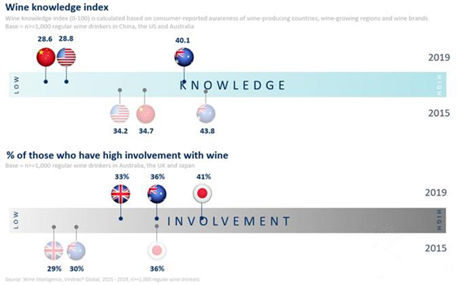 在主要市場中,澳大利亞和日本的葡萄酒市場在過去五年中增長最快。在日本,高參與度的葡萄酒消費者的比例已經從2015年的36%上升到2019年的41%,而澳大利亞高參與度的葡萄酒消費者比例從30%上升到36%。
