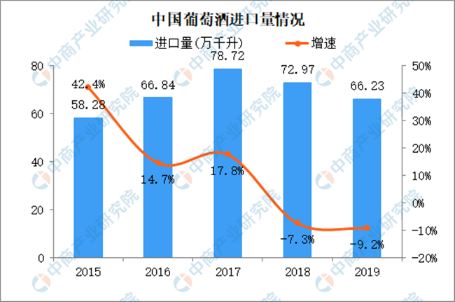 2015-2017年葡萄酒進口量穩(wěn)步上漲,但是增速放緩。此后兩年葡萄酒進口量持續(xù)下降,2019年葡萄酒進口量跌至2016年水平,進口量66.23萬千升,同比減少9.2%。