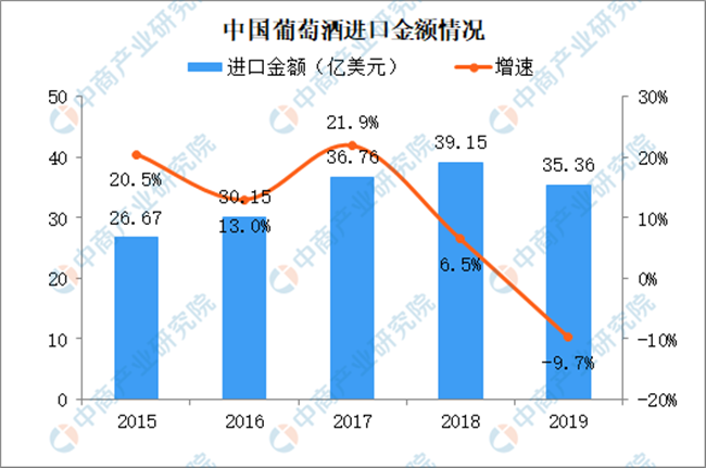 2015-2019年葡萄酒進口金額持續(xù)增長,2019年葡萄酒進口金額逼近40億美元。2019年葡萄酒進口金額小幅下跌,進口金額35.36億美元,同比減少9.7%。