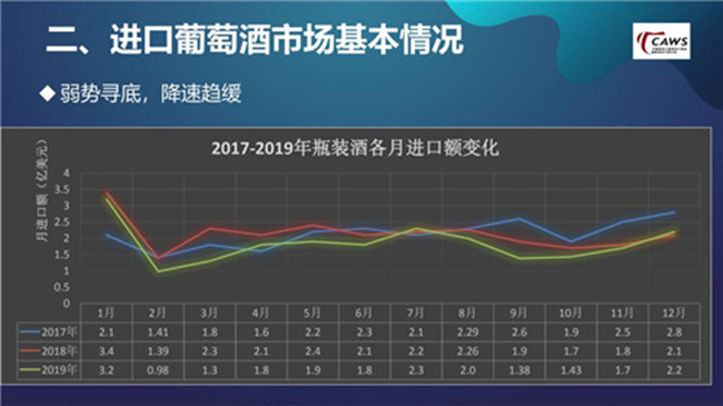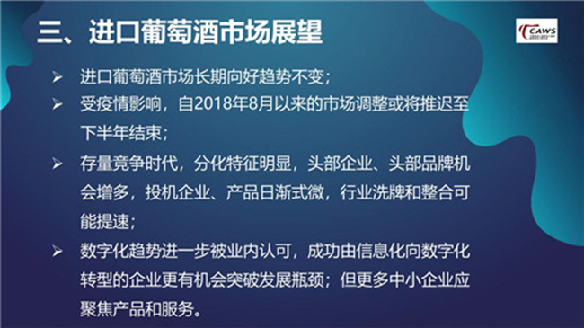 調(diào)整期被延長,進口葡萄酒市場格局競爭更為激烈。 需要注意的是,自2018年8月開始,中國葡萄酒市場進入到調(diào)整期。由于受到2020年疫情的影響,整個調(diào)整期結(jié)束時間將被延長,至于何時能結(jié)束,與當(dāng)下疫情防控工作的進展緊密相關(guān)。如果防控進展較為理想,我認為在今年下半年開始,市場將逐漸恢復(fù)。