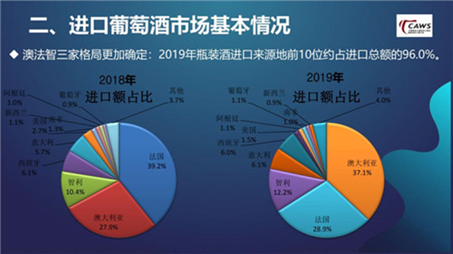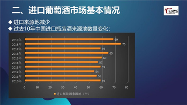此外,進口來源地減少,2019年瓶裝酒進口來源地前十位約占進口總額的96.0%。其中,又以澳大利亞葡萄酒的表現(xiàn)最為突出,在2019年以8個點的差距反超了法國葡萄酒,但在接下來的市場競爭中,澳大利亞葡萄酒也面臨一定挑戰(zhàn):首先,零關(guān)稅、大品牌驅(qū)動、投資移民等因素的推動作用會在階段性變化中逐漸減弱,澳洲與法國在接下來的市場中差距不會進一步拉大;其次,意大利、智利等國葡萄酒在中國市場競爭愈加激烈化,近兩三年來,他們明顯加強了在中國市場的投入,處在一個比較穩(wěn)定的上升階段,我個人比較看好他們接下來的表現(xiàn)。