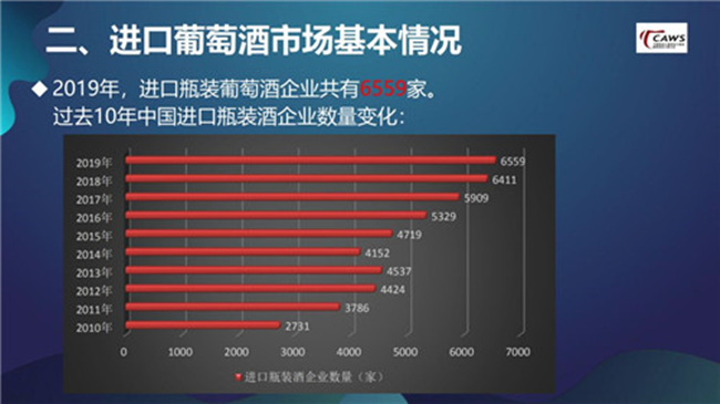進口瓶裝葡萄酒企業(yè)數(shù)量不斷增加,中小企業(yè)面臨挑戰(zhàn)。 從過去10年的數(shù)據(jù)來看,中國進口瓶裝葡萄酒企業(yè)數(shù)量整體上是不斷增加的。2019年也不例外,進口瓶裝葡萄酒企業(yè)共有6559家,比2018年增加了148家。產(chǎn)生這種情況的原因,我認為有兩個,一是葡萄酒的商品屬性,決定了它經(jīng)營上的分散化;二是中國葡萄酒企業(yè)自身韌性十足,在市場大調(diào)整時期仍在堅持。