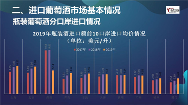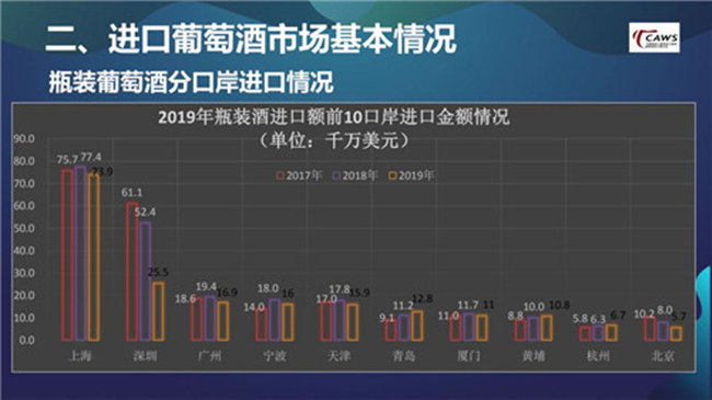 在仔細分析口岸數(shù)據(jù)后就會發(fā)現(xiàn),深圳由2018年的5.24億美元,迅速下滑到2019年的2.55億美元。我認為這與2018年,深圳口岸由于種種原因進口了大量的高端酒、奢侈酒有關(guān)。進一步去想,2019年整個大盤下跌15%,受高端酒、奢侈酒的影響較大,整個市場其實并沒有受到過多沖擊。