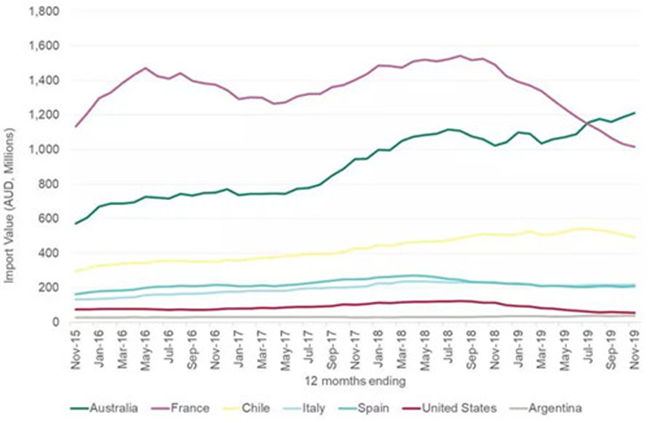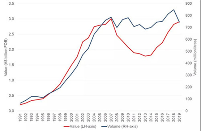 截至2019年12月底的12個月中,澳大利亞葡萄酒對中國市場(包括香港和澳門)的出口額增長12%,創下12.8億澳元新高,出口量下滑17%至1.42億升 (等量于1580萬箱9升裝)。平均出口額增長35%至8.99澳元(每升離岸價)。澳大利亞葡萄酒對中國市場的出口總額及平均出口額雙雙創下了年度新高。