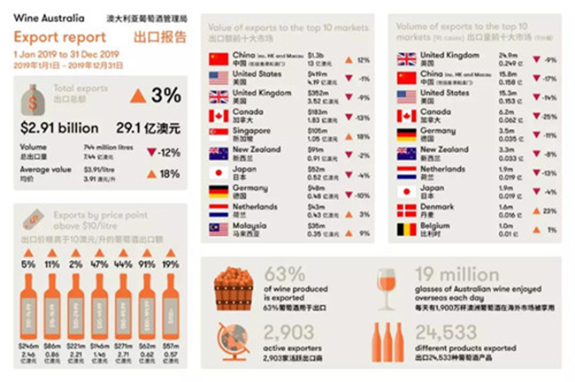 截至2019年12月底,澳大利亞葡萄酒共出口至120個市場。亞洲成為澳大利亞葡萄酒出口額增長的中心。對東北亞的出口額增長11%至13.7億澳元,對東南亞的出口額增長17%至2億澳元。此外,中東地區也出現了增長,漲幅4%至3400萬澳元。