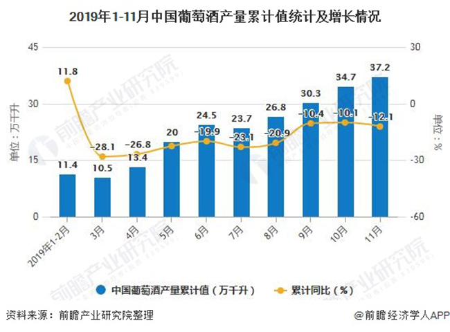 根據國家統計局數據顯示,2018年全年中國葡萄酒產量達到了62.9萬千升,累計下降7.4%。截止至2019年11月中國葡萄酒產量為4.9萬千升,同比下降5.8%。累計方面,2019年1-11月中國葡萄酒產量達到37.2萬千升,累計下降12.1%。