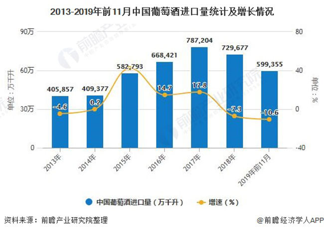 據中國海關總署數據顯示,2019年11月中國葡萄酒進口量為53218千升,同比下降-4.7%。累計方面,2019年1-11月中國葡萄酒進口量達到599355千升,同比下降10.6%。