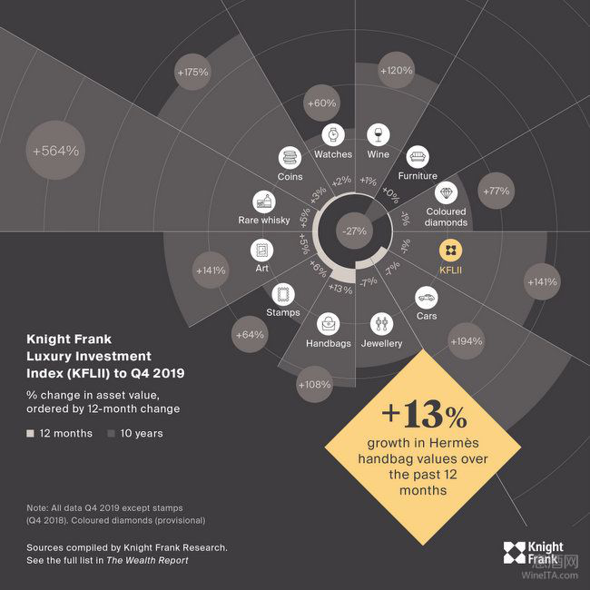 2019年,由于全球政治、經(jīng)濟(jì)領(lǐng)域中多個(gè)不確定因素的影響,讓不少投資品領(lǐng)域增長(zhǎng)乏力甚至出現(xiàn)負(fù)增長(zhǎng),例如珍稀威士忌投資指數(shù)只上升了5%,彩色鉆石、珠寶、名車等領(lǐng)域都初現(xiàn)了負(fù)增長(zhǎng),名貴家具投資指數(shù)零增長(zhǎng)。