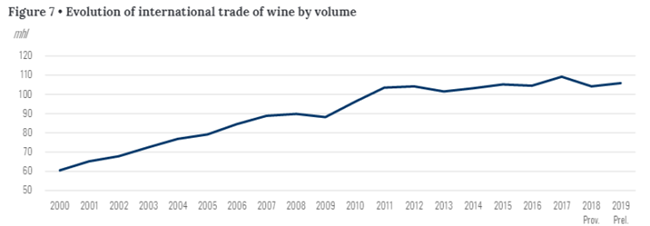 2019年世界葡萄酒消費量估計為244 百萬升,與2018年相比增加了0.1%。