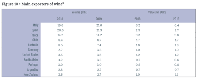 法國、意大利和西班牙是主要出口國,就2019年的價值而言,分別為98億歐元、64億歐元和27億歐元。這三個國家占2019年葡萄酒出口總值的60%。與2018年相比,新西蘭(+8.3%)、法國(+4.6%)、意大利(+3.4%)、葡萄牙(+2.5%)、智利(+2.1%)、阿根廷(+1.2%)、美國(+0.9%)和澳大利亞(+0.2%)的價值有所增長。與2018年相比,南非(-11.0%)、西班牙(-8.0%)和德國(-0.5%)的出口額有所下降。