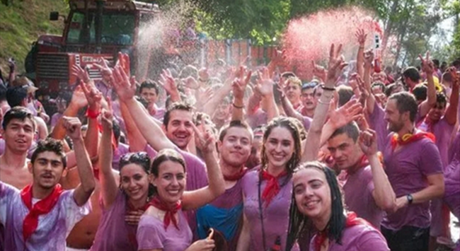 這一天,成百上千人會(huì)穿著白色衣服、系著紅色方巾,拿著水槍、噴霧器、水桶等可以裝著葡萄酒的容器作為“武器”,在街道上開(kāi)始這場(chǎng)“戰(zhàn)爭(zhēng)”。最終他們將衣服染成紫色,“幸存者們”伴隨著音樂(lè)返回拉巴斯廣場(chǎng),享用午餐(特色蝸牛)和美酒。