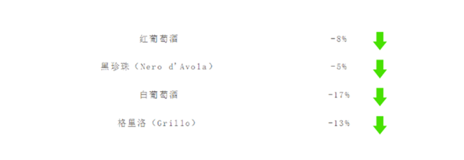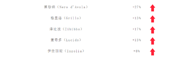 相較2018年,各葡萄品種增長如下,由此可以看出,黑珍珠(Nero d'Avola)、格里洛(Grillo)等代表的本土品種大放異彩,已經成為西西里葡萄酒的嶄新名片。