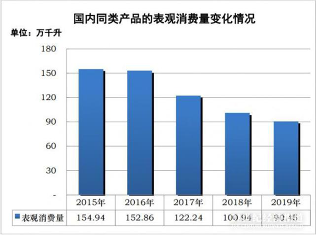 一方面,國(guó)內(nèi)產(chǎn)業(yè)同類產(chǎn)品的產(chǎn)量由2015年的116.11萬千升下降至2019年的45.15萬千升,大幅減少61.11%。