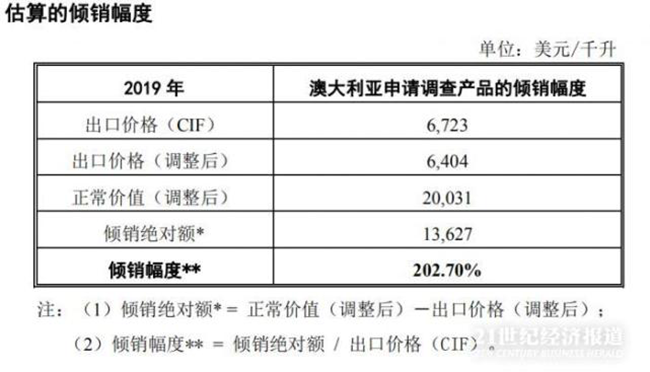 申請(qǐng)書認(rèn)為,在進(jìn)口數(shù)量持續(xù)大幅增長(zhǎng)、市場(chǎng)份額持續(xù)上升、相對(duì)于國(guó)內(nèi)同類產(chǎn)品總產(chǎn)量的比例也在持續(xù)上升的情況下,澳大利亞該類葡萄酒的降價(jià)行為對(duì)國(guó)內(nèi)產(chǎn)業(yè)造成了巨大的沖擊,申請(qǐng)書預(yù)估,澳大利亞該類葡萄酒的傾銷幅度為202.70%。