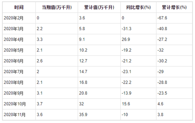 2020年1-11月全國葡萄酒產量分月數據