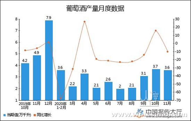 以上就是2020年1-11月全國葡萄酒產量統計,數據來源于國家統計局及中國報告大廳數據中心整理發布,僅供參考。