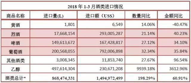 2018年1-3月,進口酒類市場延續(xù)高增速,增幅略有回調(diào):除黃酒下行外,各主要酒類保持增勢,烈酒、啤酒、葡萄酒量額均有不小幅度增長。