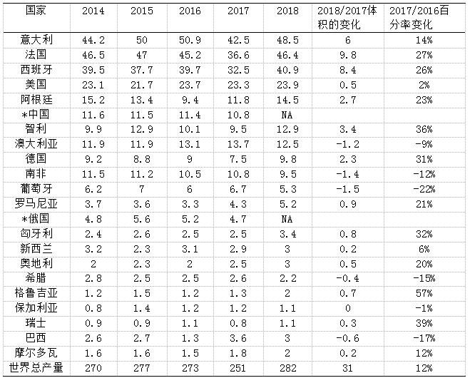 在南半球,智利產量預計為12.9億升,與2017年相比增加36%。阿根廷經過兩年的低產量后,2018年恢復到高水平,將達到14.5億升,比2017年增加23%。盡管巴西的產量比2017年下降17%,但仍將保持在較高水平,達到3.0 億升。