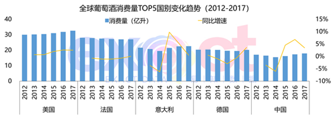 報告顯示,從2015年開始,中國葡萄酒消費量持續增加,且增速保持在3.5%-6.8%。2017年,中國葡萄酒消費量增加了0.6億升,全球占比7%,相比其他國家市場空間更大。