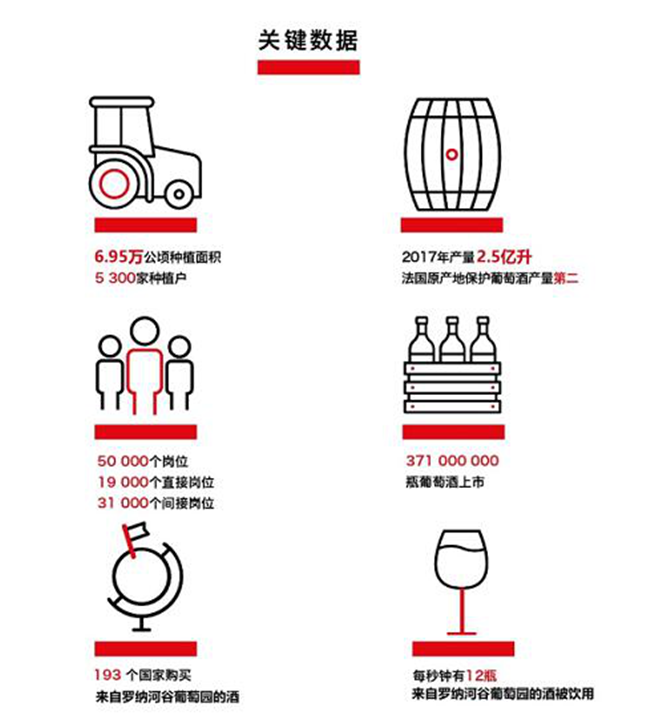 2018年, 在所有法國AOC產區中,羅納河谷占據的市場份額為11%。近5年內,(2013年至今),羅納河谷葡萄園的葡萄酒對中國的出口總量增長了151%
