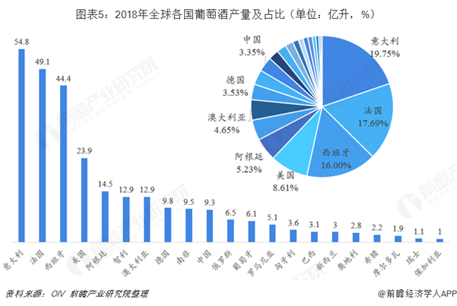 2018年,歐洲依然是全球最大的葡萄酒生產(chǎn)區(qū)域,總產(chǎn)量實(shí)現(xiàn)181.9億升,占比高達(dá)62%。世界排名前三的葡萄酒生產(chǎn)國(guó)依次是意大利(54.8億升)、法國(guó)(49.1億升)和西班牙(44.4億升),三者的產(chǎn)量總和超過了世界總產(chǎn)量的一半,達(dá)到51%。根據(jù)OIV的統(tǒng)計(jì)口徑,2018年中國(guó)葡萄酒產(chǎn)量為9.3億升,排名世界第十,全球占比3.35%。