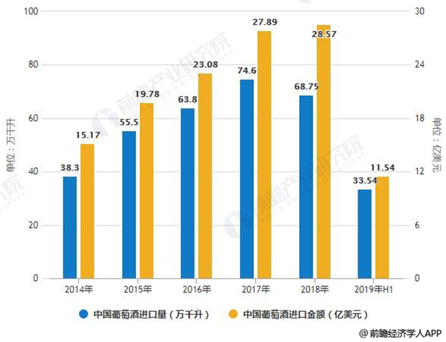 2014-2019年H1年中國葡萄酒進口量、金額統(tǒng)計情況