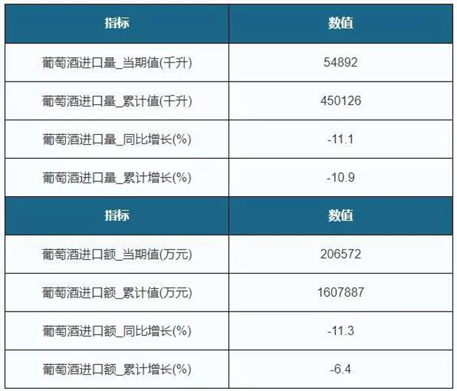 2019年8月我國葡萄酒進口量為54892千升,同比下降11.1%,進口金額為206572萬元,同比下降11.3%;1-8月進口量為450126千升,累計下降10.9%,進口金額為1607887萬元,累計下降6.4%。