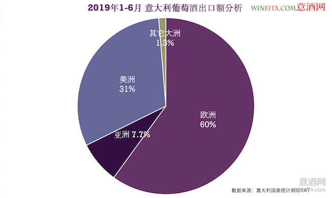 根據公布的數據,2019年上半年,意大利葡萄酒出口額達到30億歐元,較2018年同期增長了3.1%。其中歐洲所占市場份額為60%(比例較2018年同期增長3.3%),美洲所占市場份額為31%(比例較2018年同期增加1.44%),亞洲所占市場份額為7.7%(比例較2018年同期增加8%)。此外,與2018年同期相比,2019年上半年意大利葡萄酒的總出口量增長了8.8%,對歐洲的出口量增長了11.2%,對亞洲的出口量增長了19.5%,對美洲的出口量減少了0.8%。