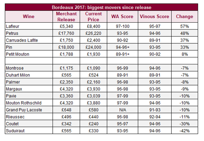 與2016年份一樣,拉弗爾Lafleur的表現(xiàn)最佳,目前價(jià)格比發(fā)布價(jià)漲了57%。一級(jí)酒莊的副牌葡萄酒也再次熱賣(mài)– 小拉菲Carruades Lafite漲價(jià)37%,而小木桐Petit Mouton則漲價(jià)8%。