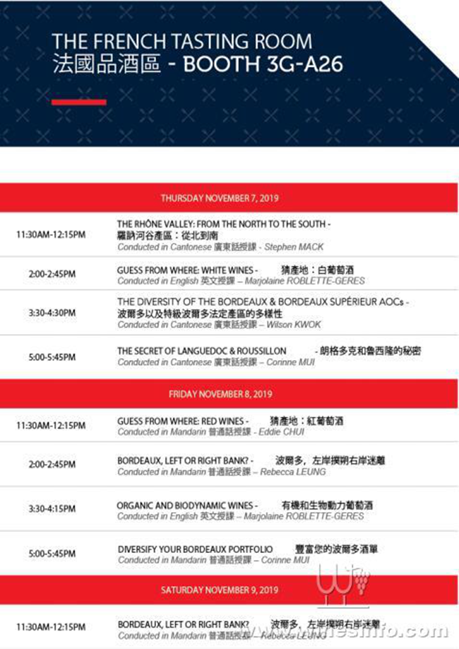 今年酒界盛事香港國(guó)際美酒展(11 月 7 至 9 日)將迎來(lái) 70 多家法國(guó)展商。佔(zhàn)地約 513 平方米的法國(guó)館位于香港會(huì)議展覽中心 3F-G,由法國(guó)商務(wù)投資署(Business France)及新阿基坦大區(qū)食品協(xié)會(huì) (AANA)籌辦。在香港市場(chǎng)排名第一的法國(guó)葡萄酒和烈酒分別佔(zhàn) 60%及 40%市場(chǎng)份額。 French Tasting Room 品酒區(qū)繼去年成功推出后,今年將重現(xiàn)法國(guó)館。法國(guó)展商將在共 9 場(chǎng)主題品酒環(huán)節(jié)上陳列各款佳釀,這對(duì)于進(jìn)口商、專業(yè)人士及業(yè)馀愛(ài)好者來(lái)說(shuō)是一個(gè)難能可貴的大滿足機(jī)會(huì),品嚐出產(chǎn)自法國(guó)的純釀。
