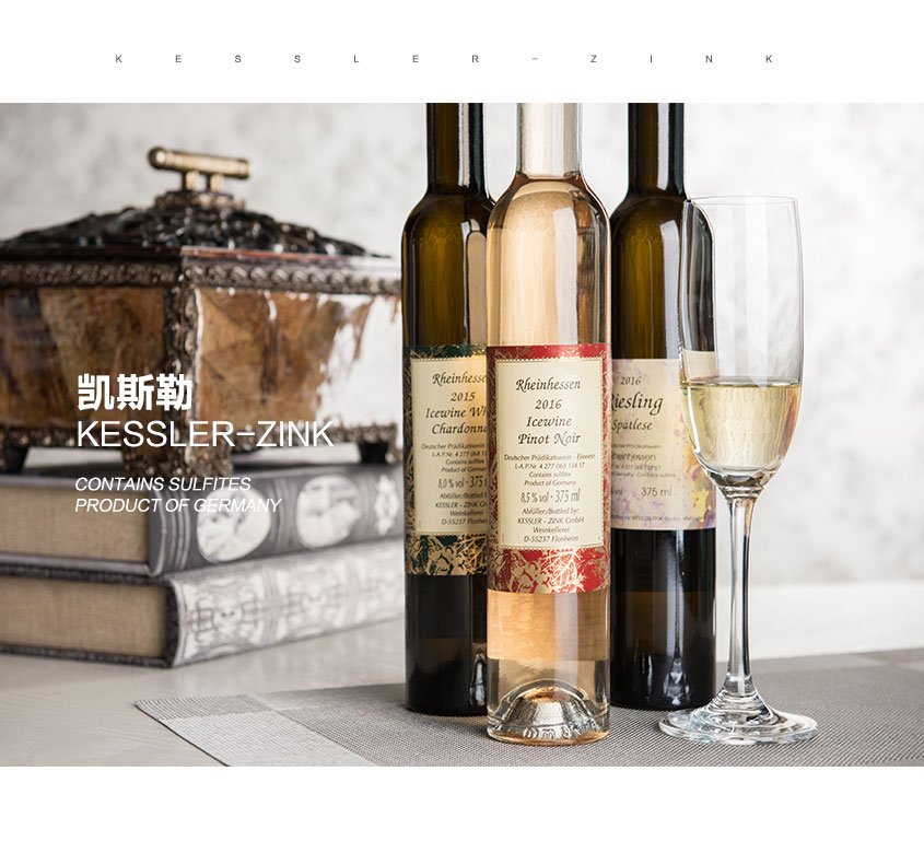 原產地:德國-萊茵黑森 級別:Qmp-Eiswein(冰酒) 年份:2016 類型:甜型 葡萄品種:100%黑皮諾Pinot Noir 酒精度:8.5%vol 凈含量:375ml 顏色:棕紅的酒色,清澈亮麗; 酒香:有著成熟成熟檸檬和蜂蜜的香味; 味蕾:嘗起來有如熱帶水果荔枝,甜瓜和紅糖的味道。 食物搭配:可以作為開胃菜或搭配巧克力蛋糕甜點等。 最佳適飲溫度:4-6℃ 建議醒酒時間:即開即飲