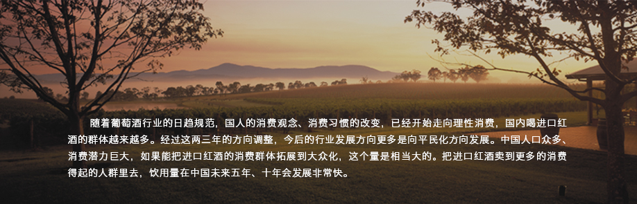 剛開始做了十多年的傳統行業,跟人合伙辦過工廠、做過外貿、房地產等等很多行業,一直在尋找一個自己感興趣又能夠為之奮斗一生的事業。直到2006年,開始接觸到進口葡萄酒行業,并對它產生了濃厚的興趣,還專門對國內的進口葡萄酒市場進行調研,意識到這是一個具有巨大盈利空間的新興產業。當時,國內的酒類市場消費以白酒、啤酒為主,而葡萄酒又以國產酒為主,國內消費者對于進口紅酒的概念還非常模糊,進口葡萄酒只有在高端市場才能看到,而中國13億消費者,市場潛力巨大,如果能把國外品質好性價比又高的葡萄酒引進到國內,一定有很好的發展前景。